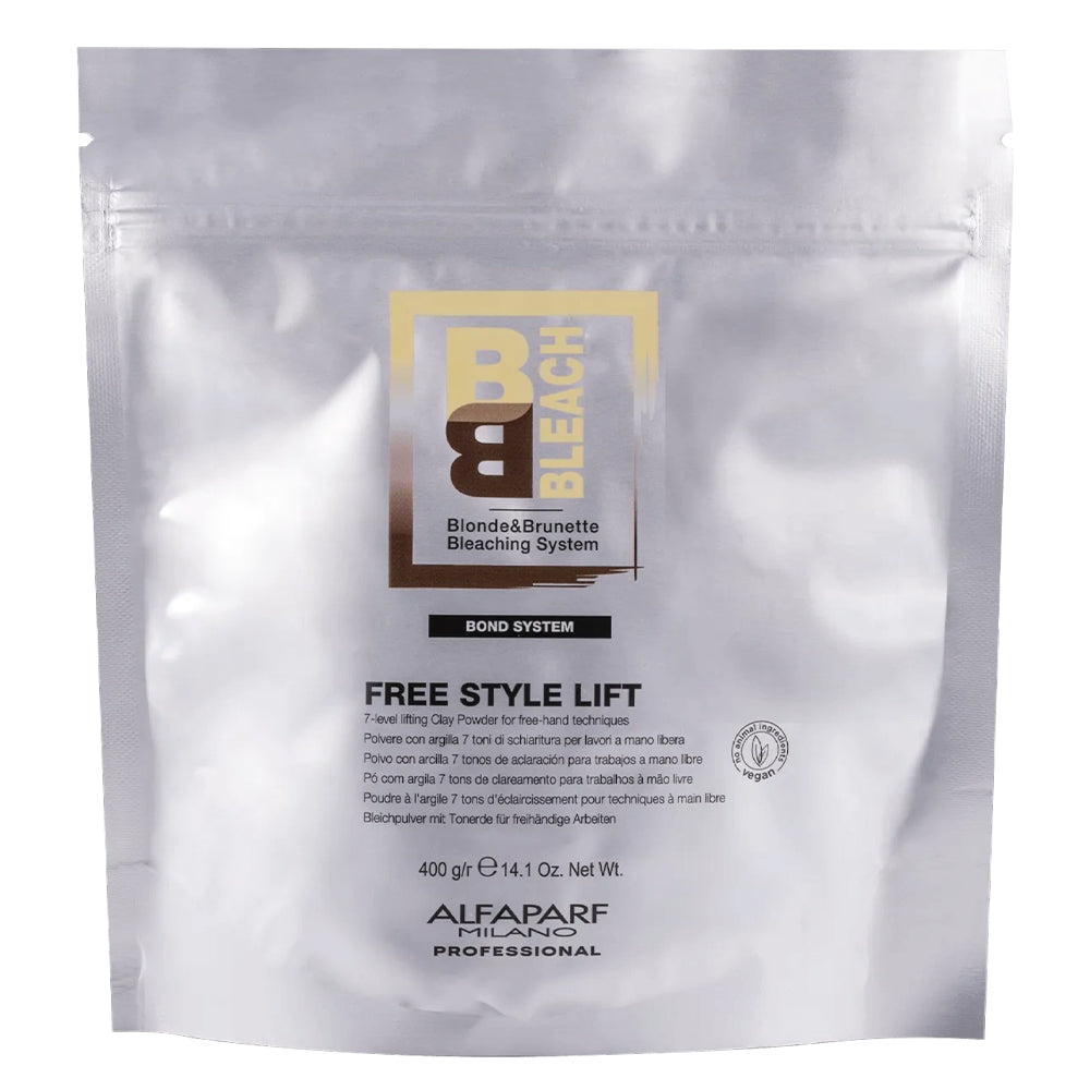 Alfaparf Milano BB Bleach Free Style Lift Clay Powder 7 Levels Of Lift allows for easy and precise application, ideal for use with a freehand technique. The Bond System is a protection and reconstruction amplifier, which is able to offer a double action; reconstructing the hair from the inside, penetrating into the cortex and repairing it from the outside, giving effective protection both from external agents and during the entire bleaching service. With emollient Marula Oil, nourishes the hair with its antioxidant properties, helping to give it a cosmetically radiant appearance after treatment. No ingredients of animal origin or animal-derivatives were used in this product.